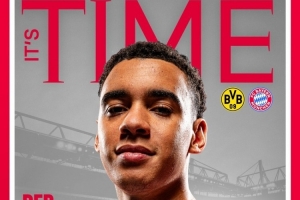 拜仁本次發(fā)布的海報設計獨具匠心,采用了知名雜志《TIME》的封面風格。拜仁前鋒穆西亞拉身著球隊紅白戰(zhàn)袍占據封面,海報上方印有醒目的紅色大字“IT'S TIME”,下方則用德語標注"經典對決”,并配上了主帥孔帕尼的評價:“這是一場頂級較量”。