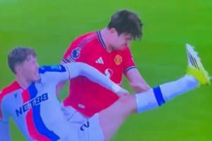 畫面中,馬奎爾與水晶宮球員對抗,對方嘗試抬腳接球,馬奎爾則用頭拼搶,水晶宮球員腳尖離馬奎爾還有一段距離,馬奎爾痛苦捂住頭部。
