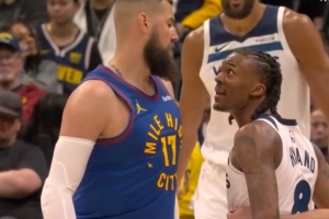 GIF-瓦蘭掩護(hù)犯規(guī)后又支肘打到海蘭德臉部,雙方險(xiǎn)些發(fā)生小沖突,裁判回看升級(jí)瓦蘭一級(jí)惡意
