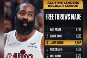 本場(chǎng)比賽過(guò)后,哈登生涯總罰球命中數(shù)來(lái)到8535個(gè),超越摩西·馬龍(8531個(gè))升至歷史第3,排在第2的是詹姆斯(8810個(gè))。