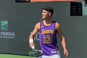 這是繼此前備戰(zhàn)澳大利亞網(wǎng)球公開(kāi)賽時(shí)身穿詹姆斯球衣訓(xùn)練后,阿爾卡拉斯再次穿上詹姆斯球衣進(jìn)行賽前訓(xùn)練。