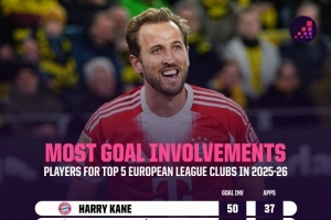 體育資訊3月3日訊 Opta統(tǒng)計(jì)了五大聯(lián)賽球員本賽季的參與進(jìn)球數(shù)量,并列出榜單,凱恩參與50球居首,姆巴佩參與43球次席。