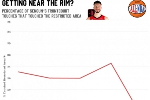 申京各個賽季在前場拿球時禁區(qū)觸球占比,本賽季僅16.6%,創(chuàng)生涯新低