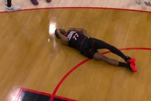 上半場(chǎng)最后一攻,埃奇庫(kù)姆反擊追身三分出手,被身后追防的卡特·布萊恩特撞到失去平衡摔倒,背部著地受傷離場(chǎng),76人官方隨后宣布埃奇庫(kù)姆背傷不會(huì)回歸。