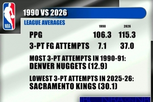 2025-26賽季,聯(lián)盟場(chǎng)均得到115.3分,場(chǎng)均三分出手37.0次,最多三分出手的球隊(duì)是國(guó)王場(chǎng)均30.1次