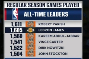 詹姆斯已經(jīng)出戰(zhàn)1605場(chǎng)常規(guī)賽歷史第二,距離第一的帕里什只差6場(chǎng)。