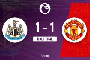 上半場補時3分鐘,紐卡1-1曼聯(lián)。
