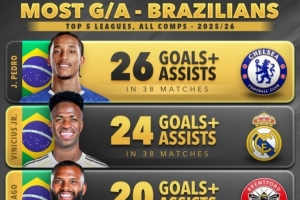 體育資訊3月5日訊 Score90統(tǒng)計了本賽季五大聯(lián)賽巴西球員參與進球數(shù)量,并列出榜單,若昂·佩德羅參與26球居首,維尼修斯參與24球次席。