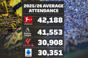 體育資訊3月5日訊 德甲統(tǒng)計(jì)了本賽季歐洲聯(lián)賽的場均上座人數(shù),并列出榜單,德甲居首,英超、西甲二三位,德乙排名第5位。