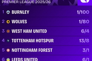 本賽季英超降級賠率排名: