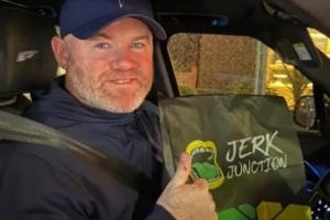 魯尼在社交媒體展示了他從威爾姆斯洛的Jerk Junction餐廳買的外賣,這位曼聯(lián)歷史最佳射手在車?yán)锬弥澄锇b袋,咧嘴笑著并對(duì)鏡頭豎起大拇指。