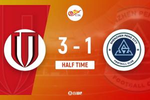 第45+1分鐘,王東升右路傳中,禁區(qū)內(nèi)費(fèi)利佩頭球沒頂?shù)剑T前胡荷韜端射破門!成都蓉城3-1領(lǐng)先深圳新鵬城↓