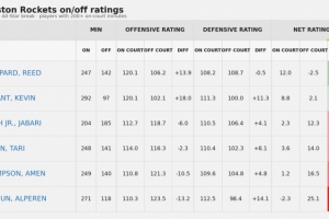 注:on-off值統(tǒng)計(jì)的是在場(chǎng)凈效率與不在場(chǎng)凈效率的差值,本次統(tǒng)計(jì)要求至少打200分鐘。