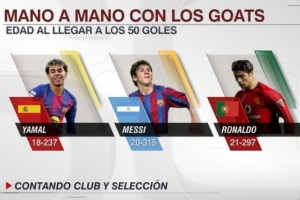 據(jù)統(tǒng)計,18歲237天的亞馬爾生涯各項賽事已經(jīng)打進50粒進球(俱樂部+國家隊),梅西打進生涯50球時為20歲315天,C羅則是21歲297天。