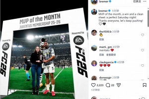 布雷默當(dāng)選尤文2月份最佳球員,賽前他領(lǐng)取了獎(jiǎng)杯,賽后布雷默社媒曬出領(lǐng)獎(jiǎng)?wù)掌?,并?xiě)道:“月最佳球員、勝利和零封,一個(gè)完美的周六之夜!感謝所有人,讓我們繼續(xù)加油!”