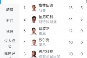 本場(chǎng)比賽格林伍德打進(jìn)全場(chǎng)唯一進(jìn)球,在目前的法甲射手榜上,格林伍德24場(chǎng)打進(jìn)15球位居首位。