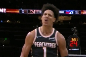 GIF-杰倫·約翰遜強突頂著兩人雙手滑翔暴扣