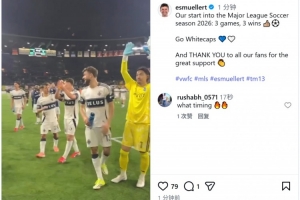 溫哥華白浪本賽季美職聯(lián)開局取得3連勝,穆勒社媒慶祝勝利:“我們2026賽季的美職聯(lián)開局——3戰(zhàn)3勝,加油溫哥華白浪!感謝所有球迷的大力支持?!?/p>
