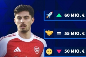 哈弗茨本賽季飽受傷病困擾,在英超只有5次出場,送出1次助攻。目前哈弗茨德轉身價5500萬歐,德轉給出其更新后最高身價可能升至6000萬歐,最低則會跌至4500萬歐。