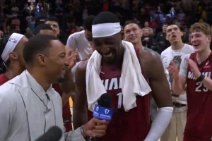賽后,隊(duì)友鮑威爾客串了一把記者,問到:“當(dāng)聽到自己的名字與張伯倫(100分)、科比(81分)比肩,你什么感受?”