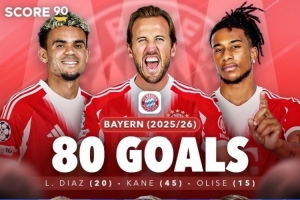 體育資訊3月11日訊 本賽季歐洲五大聯(lián)賽的攻擊線,風(fēng)頭最盛的莫過(guò)于拜仁凱恩、迪亞斯、奧利塞組成的三叉戟組合。據(jù)score90數(shù)據(jù)統(tǒng)計(jì),拜仁三叉戟截止目前已經(jīng)打進(jìn)80球,距離當(dāng)年在歐洲所向披靡的巴薩MSN組合最高單賽季紀(jì)錄131球,還差51球。