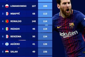 體育資訊03月11日訊 德國足球轉(zhuǎn)會市場統(tǒng)計并列出了歐冠歷史上,所有至少打進20球的球員中,每球平均用時最短的球員前十。梅西以平均105分鐘一球排名第一,萊萬、姆巴佩排名前三。