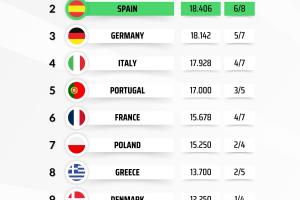 西班牙排名第二,只領(lǐng)先德國(guó)0.264分。