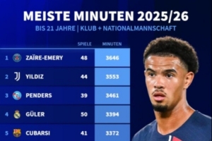 體育資訊3月13日訊 德轉(zhuǎn)統(tǒng)計(jì)本賽季五大聯(lián)賽U21球員出場(chǎng)時(shí)間榜,巴黎球員埃梅里3646分鐘第一,伊爾迪茲第二,亞馬爾第七。