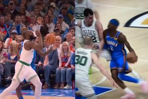 比賽中,SGA在一次合球掛手臂造成犯規(guī)后,杰倫·布朗當(dāng)即對裁判表示:“這不是籃球。”