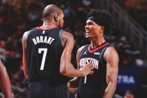 賽后火箭官方發(fā)布贏球海報(bào),杜蘭特和阿門(mén)·湯普森成為封面人物。