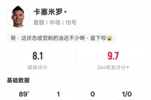 體育資訊3月15日訊 英超第30輪,曼聯(lián)主場迎戰(zhàn)維拉,卡塞米羅首發(fā)出戰(zhàn),打進1粒進球,送出1次關鍵傳球,還有3次解圍,1次攔截和1次搶斷,評分8.1。