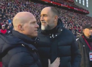 轉(zhuǎn)播鏡頭顯示,比賽開始前,圖多爾出現(xiàn)在安菲爾德場邊,他走向一個(gè)穿著深色外套,雙臂交叉的人面前,拍了拍他的肩膀,打招呼并與他握手——可能認(rèn)為對方是斯洛特。