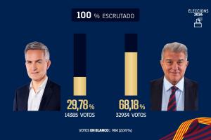 巴薩俱樂部主席選舉結(jié)束,拉波爾塔成功當(dāng)選。他獲得了32934張票,得票率68.18%?!妒澜珞w育報》指出,在巴薩俱樂部歷史上的所有主席選舉中,得票數(shù)比拉波爾塔更高的只有2010年的羅塞爾,當(dāng)時他獲得了35021張票。而得票率比拉波爾塔更高的只有1997年的努涅斯,當(dāng)時他的得票率是76.31%。