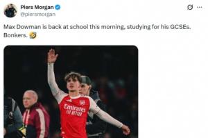 體育資訊03月16日訊 今天是周一,英國(guó)名嘴、著名阿森納球迷皮爾斯·摩根社媒發(fā)帖,調(diào)侃阿森納16歲小將道曼今天還要去上學(xué)。