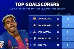 體育資訊3月16日訊 德轉列五大聯(lián)賽U21球員本賽季聯(lián)賽進球榜,亞馬爾14球居首,揚·迪奧曼德10球第二。