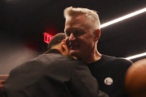 賽后勇士全隊(duì)在更衣室祝賀科爾,庫(kù)里為科爾擊地“助攻”送上比賽用球,并祝賀道:“在我們結(jié)束之前(要先祝賀你),12個(gè)賽季為這支一支難以置信的球隊(duì)做所的事(600勝)?!?/p>