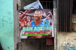 霍華德社媒曬出的照片中,菲律賓球迷慶祝阿德巴約拿到83分,但是用的是霍華德的照片?;羧A德還曬出了一張兩人照片對比。