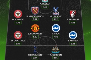 中場(chǎng):瓦塔拉(布倫特福德)、B費(fèi)(曼聯(lián))、格羅斯(布萊頓)、明特(布萊頓)