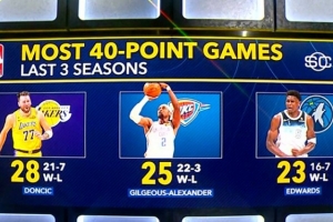 近3季40+排名:東契奇28場(21勝7負(fù))、亞歷山大25場(22勝3負(fù))、華子23場(16勝7負(fù))