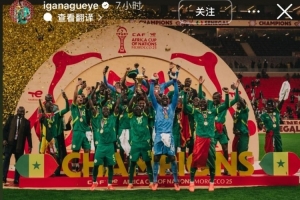 效力埃弗頓的蓋耶在社媒曬出了球隊(duì)奪得非洲杯時(shí)的慶祝照,并配文寫道: