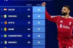 1、薩拉赫 97場50球