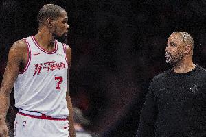 杜蘭特本場比賽依舊受困于包夾,上半場僅2分。雖然第三節(jié)復(fù)蘇6中5得到13分,但末節(jié)杜蘭特再次消失僅得3分。
