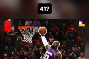 賽后,拉拉維亞轉(zhuǎn)發(fā)了詹姆斯的一張騰空海報(bào),并寫道:“41歲?”