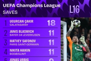 據(jù)Squawka統(tǒng)計,加拉塔薩雷門將恰基爾對陣利物浦兩回合做出18次撲救,包括撲出薩拉赫的點球,本屆1/8決賽撲救次數(shù)最多。恰基爾次回合比賽做出11次撲救,近10個賽季歐冠淘汰賽單場撲救次數(shù)最多。