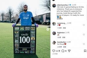 桑切斯社媒曬出與百場里程碑紀念品的合照,配文:“100場比賽!達成這一里程碑的感覺真特別,感謝一路上給予幫助和支持的每個人,喜歡與這群隊友并肩作戰(zhàn)的感覺,我已準備好迎來更多比賽?!?/p>