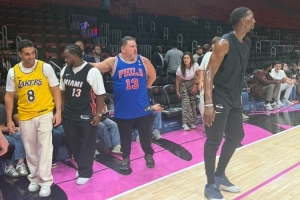 賽前阿德巴約來到場上熱身,場邊三位球迷分別穿著科比、阿德巴約和張伯倫的球衣亮相。