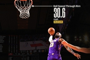 根據(jù)統(tǒng)計,詹姆斯的這記勢大力沉的扣籃起跳距離為3.2米,籃球穿越籃筐的速度為49.2公里/小時。