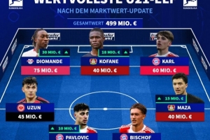 體育資訊3月21日訊 德古轉(zhuǎn)會(huì)市場(chǎng)列出德甲U21球員身價(jià)最高陣容,帕夫洛維奇、卡爾、揚(yáng)·迪奧曼德、武什科維奇在列。