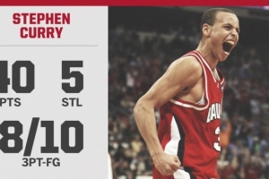 本場比賽,當(dāng)時效力于戴維森學(xué)院的庫里出戰(zhàn)39分鐘,22投14中,三分球10中8、罰球6中4,砍下40分3籃板2助攻5搶斷,其中下半場則是貢獻30分。