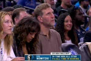 鏡頭捕捉到,獨行俠名宿諾維茨基來到現(xiàn)場觀看比賽。